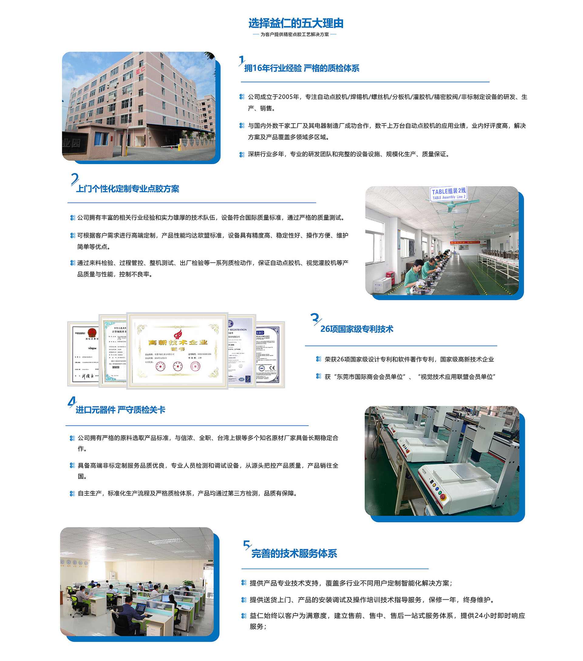 凯发k8天生赢家一触即发成立于2005年9月,是一家专业从事自动化点胶设备研发、制造和销售为一体的高新技术企业。研发力量雄厚,具备精湛的技术、优质的服务。主要产品包括:全自动点胶机、双组份灌胶机、热熔胶点胶机,在线式视觉点胶系统、胶量控制器、高速压电喷射阀、精密螺杆泵、螺丝机、焊锡机等。产品广泛应用于无线通信、电子、半导体、太阳能、汽车、医疗器械、工艺品和化学产业等---这些所有的工业领域都在致力创造高利润高价值产品的技术研发。例如产品的生产量和质量上的提高,对一家企业来说,直接与企业的发展息息相关。 液体控制技术和点胶设备广泛地应用到现代工业中的各种生产领域。随着日新月异的工业发展的需要,液体控制技术和点胶设备也在不断的发展到超高精密控制和多样化及专业化。 东莞市益仁实业有限公司在中国的液体控制技术和点胶设备产业中己经取得了巨大的成长。在过去的十六年里,益仁以其专业性和创造性,在中国的液体控制...